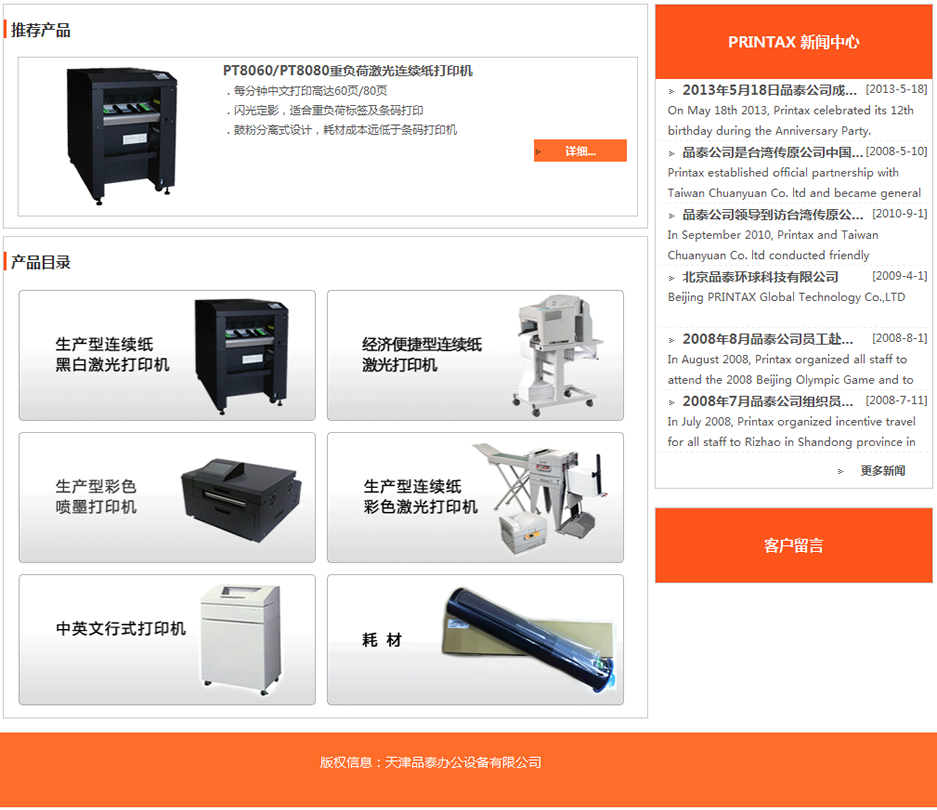 品泰公司是一家专业从事高速打印设备的高新技术公司。设有天津品泰办公设备有限公司、北京品泰环球科技有限公司、新加坡PRINTAX ASIA PTE.LTD。天津品泰办公设备有限公司和北京品泰环球科技有限公司主要负责中国市场,新加坡PRINTAX ASIA PTE.LTD主要负责亚洲市场。在全国多个省会城市设有办事处和售后服务中心。公司在国内高速打印市场上有很高的份额,是目前国内打印行业规模最大、销量最多、服务最好的全国化企业之一,销售及售后服务网络遍布全中国。